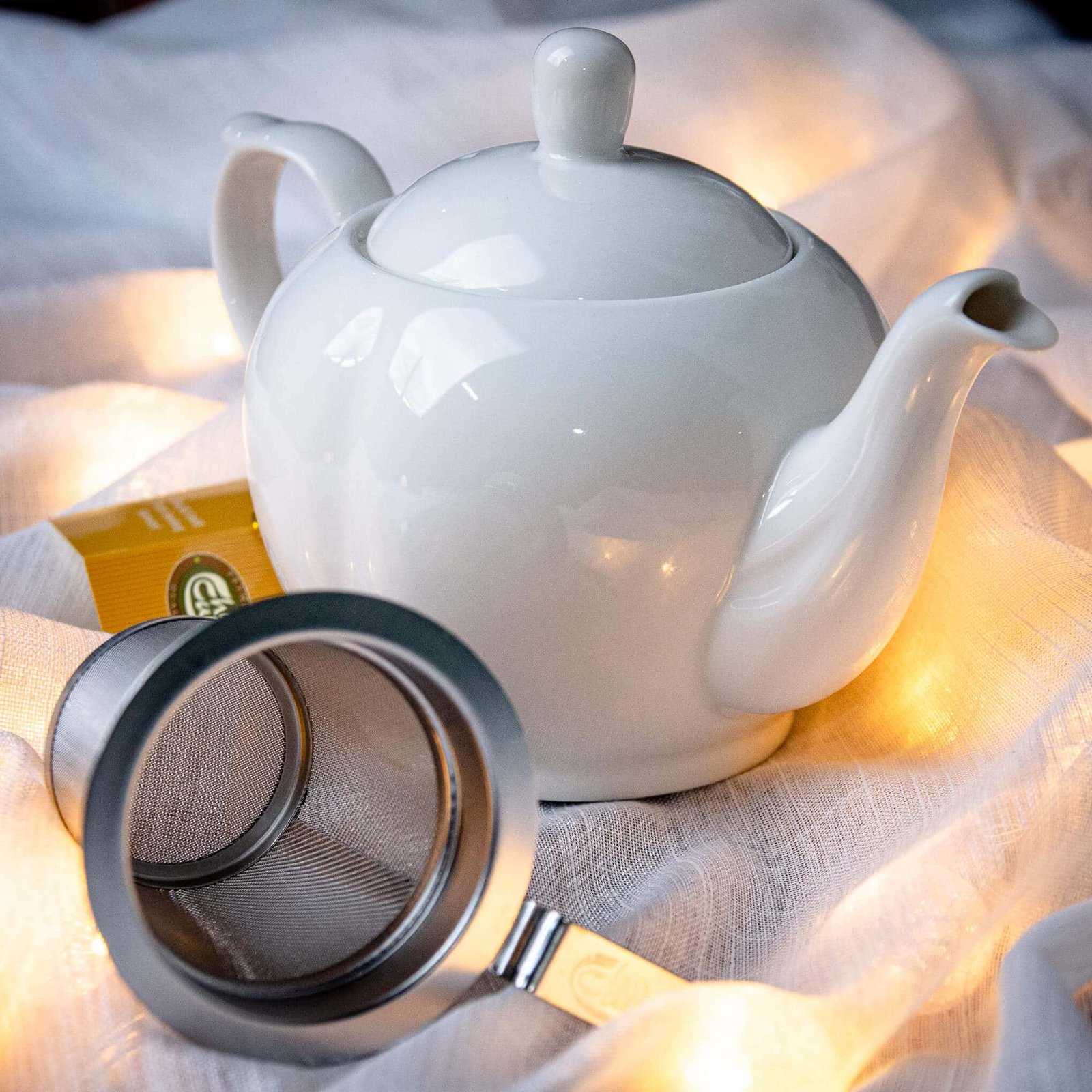 | Bule de porcelana branca com infusor em aço inox