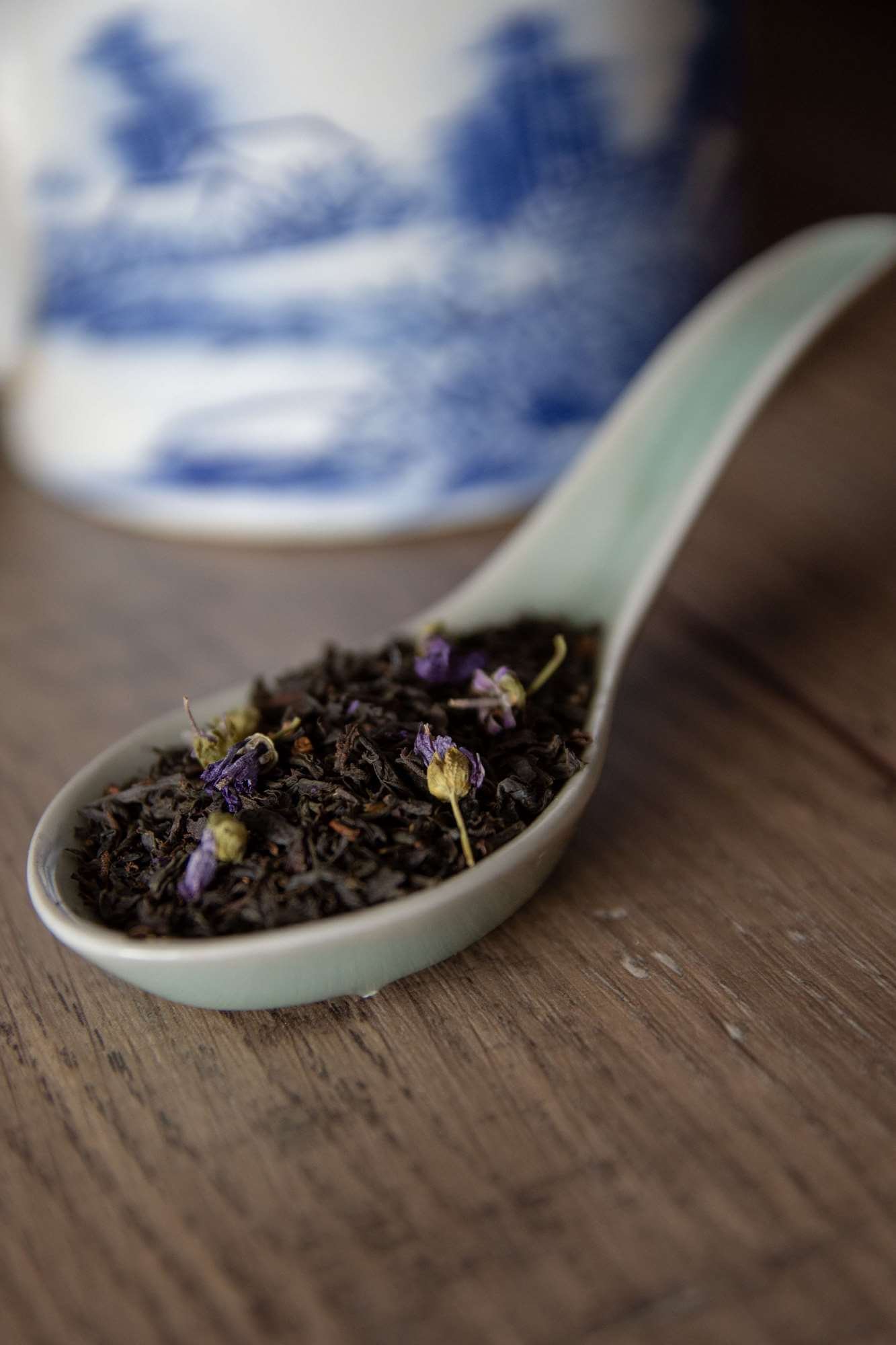 Mistura de chás pretos Ceilão (Sri Lanka) e Yunnan (China) com óleo natural de bergamota da região de Nancy, França.