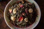 Chá verde Sencha (Japão), pedaços de lichia desidratada, pedaços de morango desidratado, camomila e pétalas de rosa.