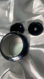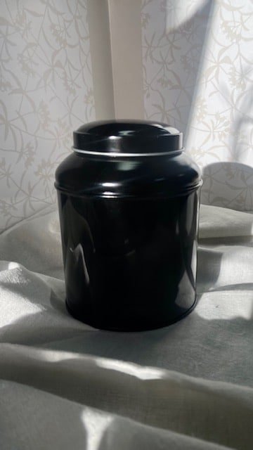 Uma lata preta elegante, com um acabamento e vedação essencial para armazenar o seu chá.